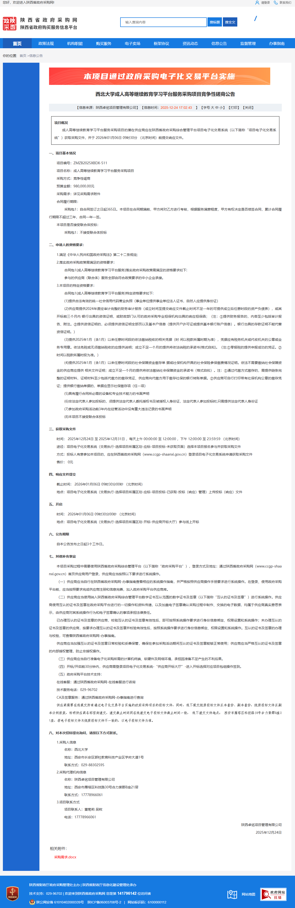 西北大学成人高等继续教育学习平台服务采购项目竞争性磋商公告