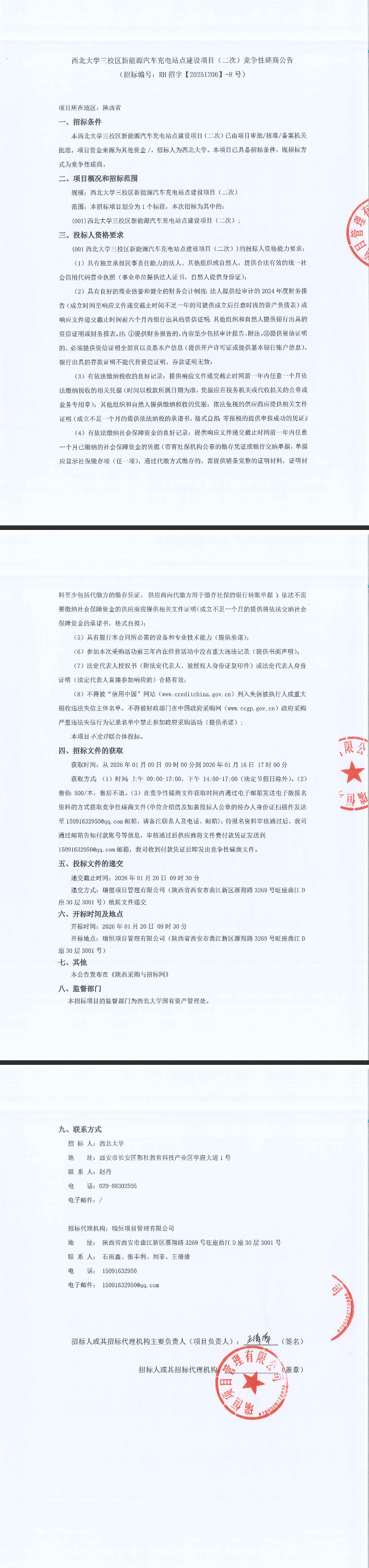 西北大学三校区新能源汽车充电站点建设项目(二次)竞争性磋商公告