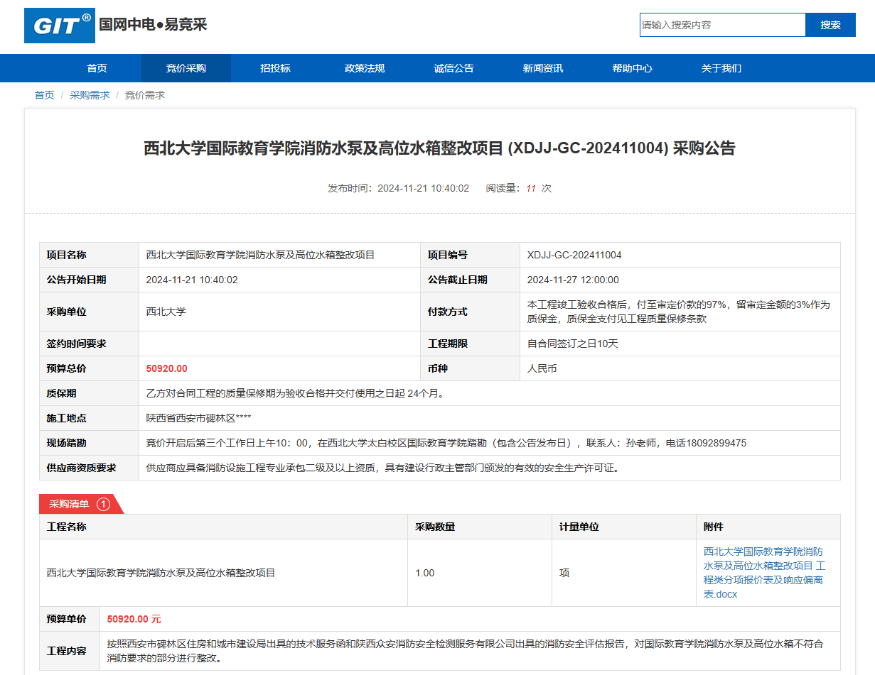 西北大学国际教育学院消防水泵及高位水箱整改项目(XDJJ-GC-202411004)竞价采购公告