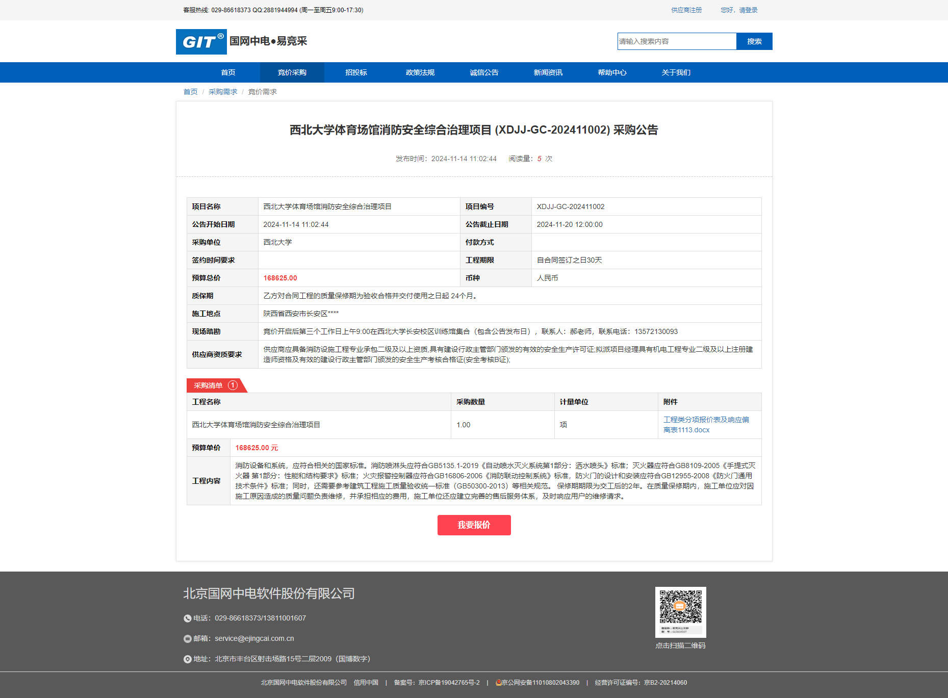 西北大学体育场馆消防安全综合治理项目 (XDJJ-GC-202411002) 采购公告
