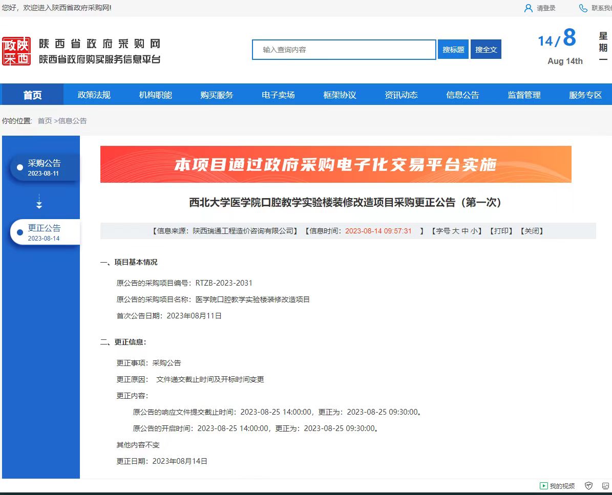 西北大学医学院口腔教学实验楼装修改造项目采购更正公告(第一次)