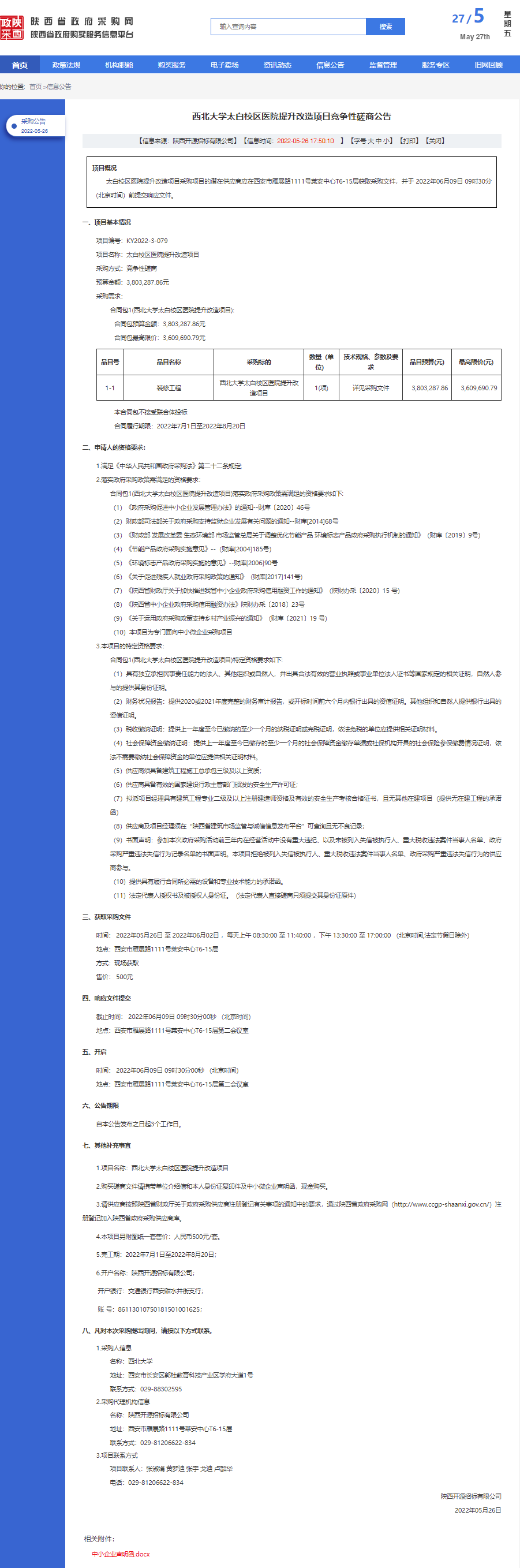 西北大学太白校区医院提升改造项目竞争性磋商公告