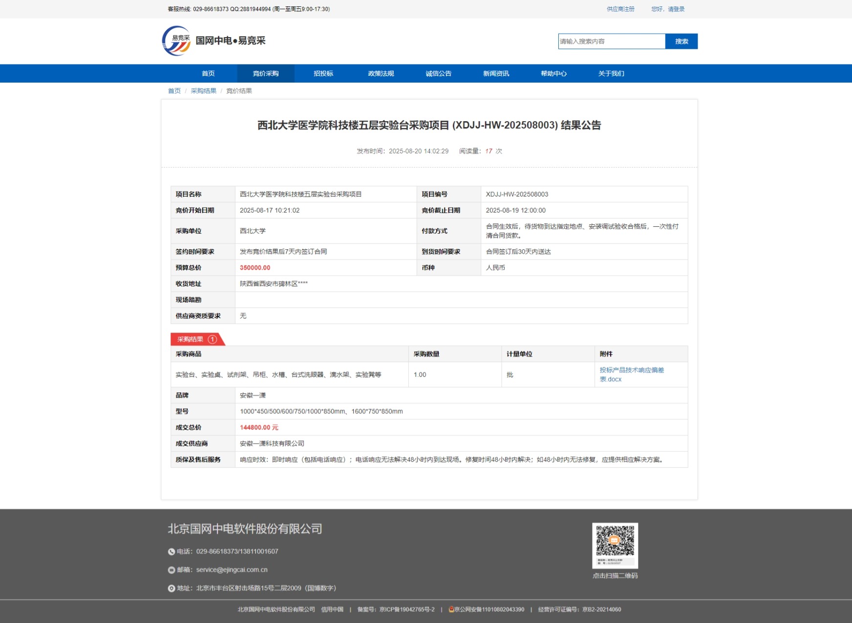 西北大学医学院科技楼五层实验台采购项目 (XDJJ-HW-202508003) 结果公告