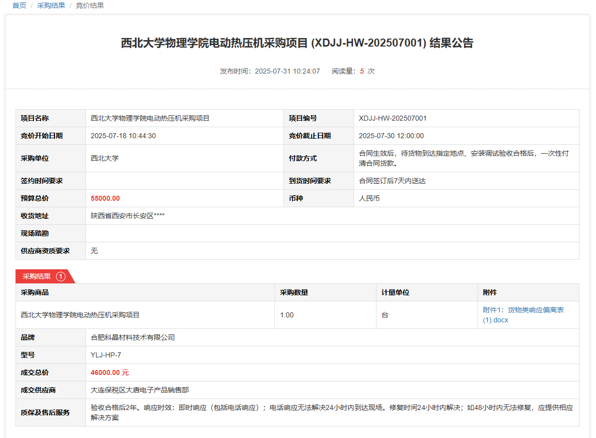 西北大学物理学院电动热压机采购项目(XDJJ-HW-202507001)竞价结果公告
