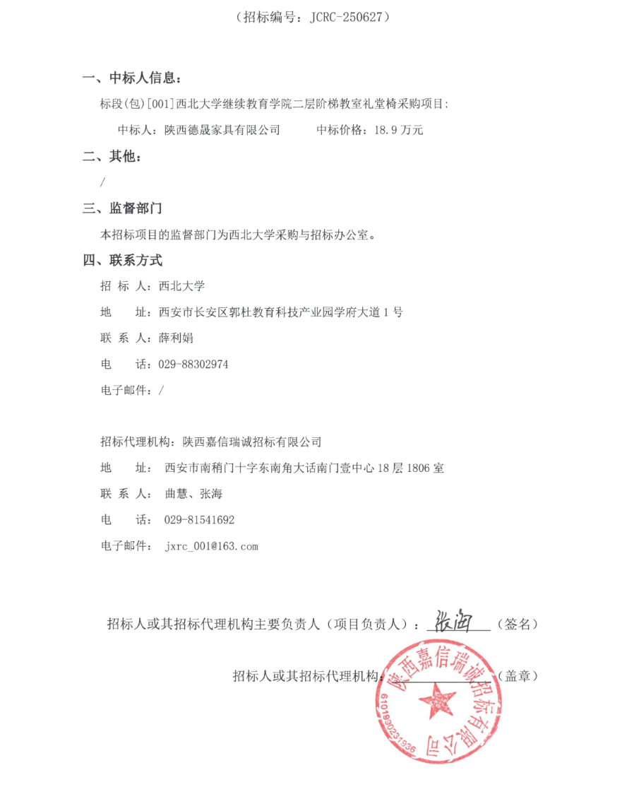 西北大学继续教育学院二层阶梯教室礼堂椅采购项目成交结果公告