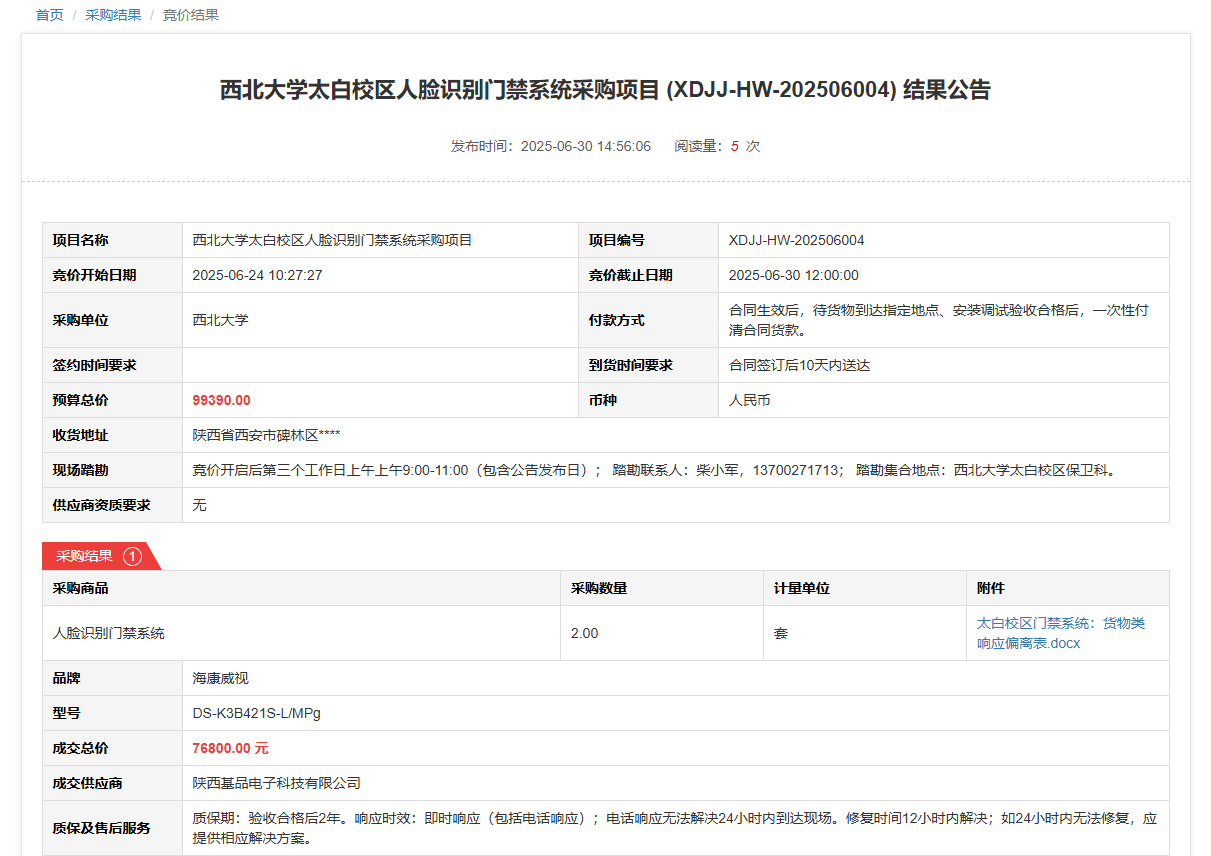 西北大学太白校区人脸识别门禁系统采购项目(XDJJ-HW-202506004)竞价结果公告
