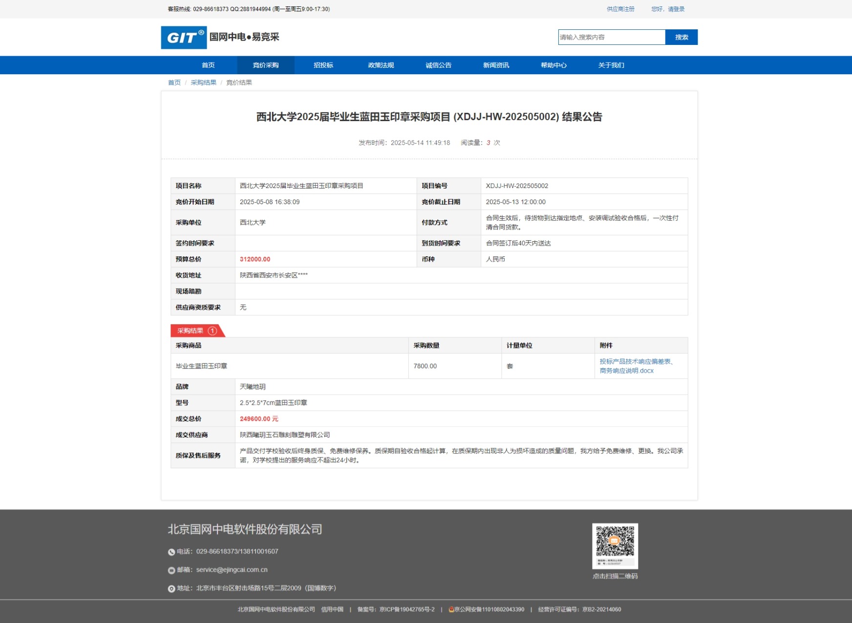 西北大学2025届毕业生蓝田玉印章采购项目 (XDJJ-HW-202505002) 竞价结果公告