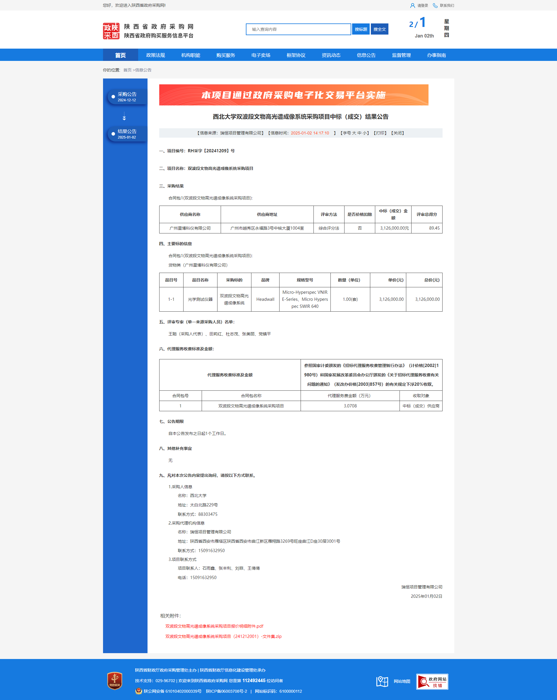 西北大学双波段文物高光谱成像系统采购项目中标(成交)结果公告