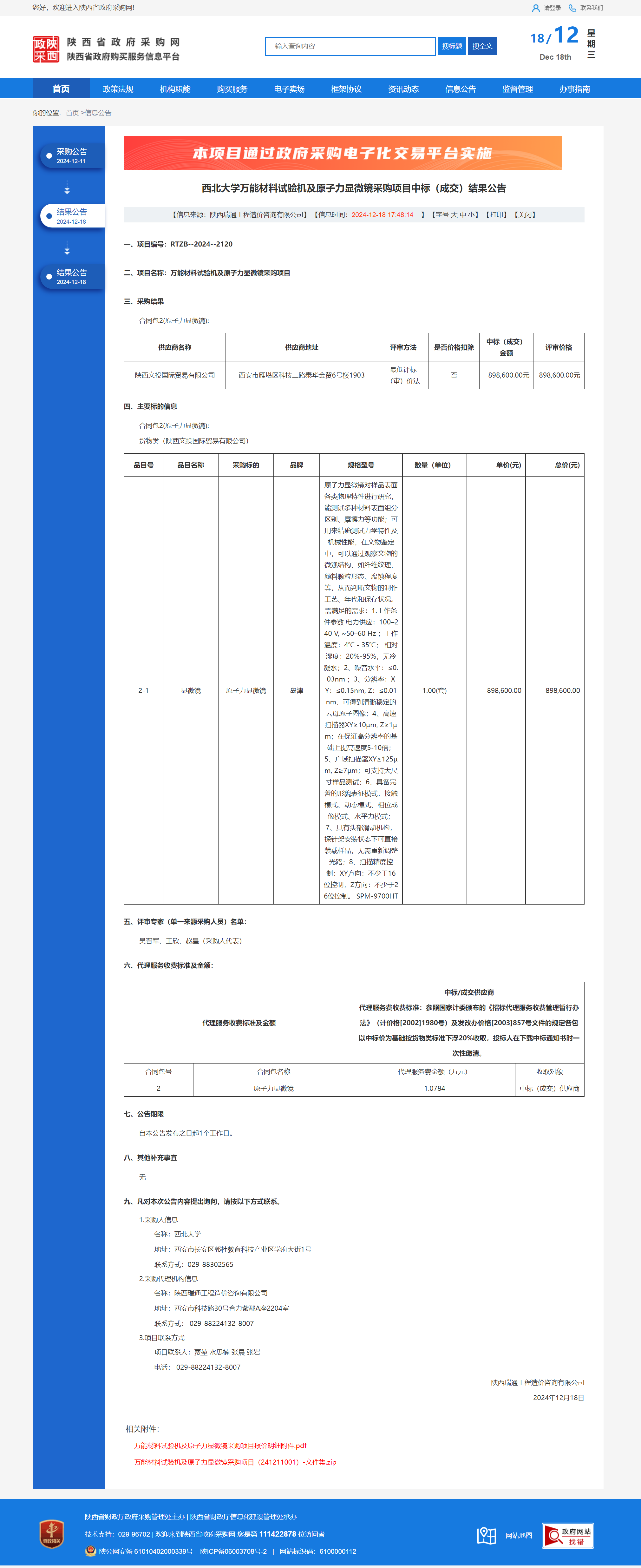 西北大学万能材料试验机及原子力显微镜采购项目中标(成交)结果公告