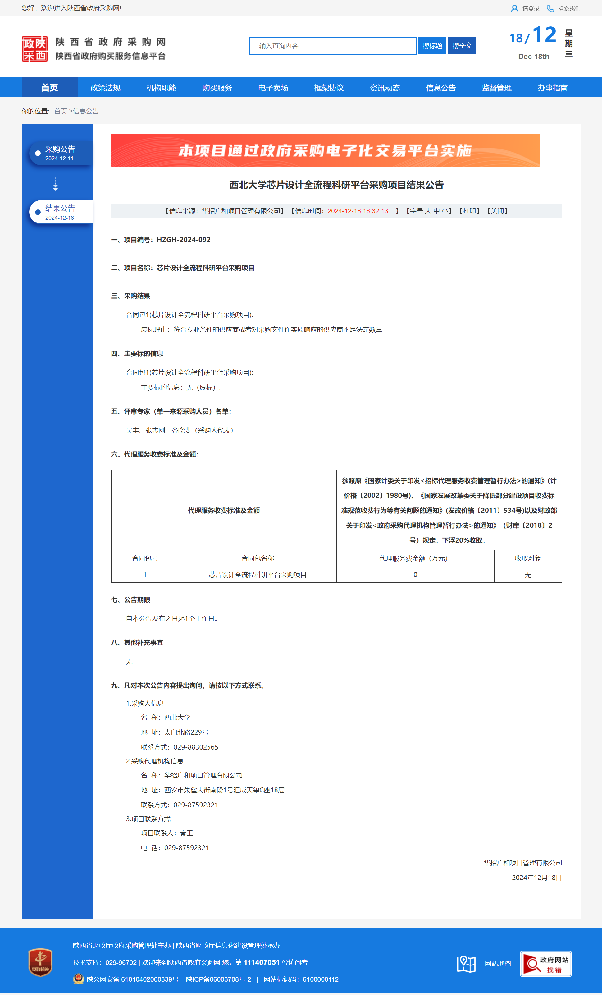 西北大学芯片设计全流程科研平台采购项目结果公告