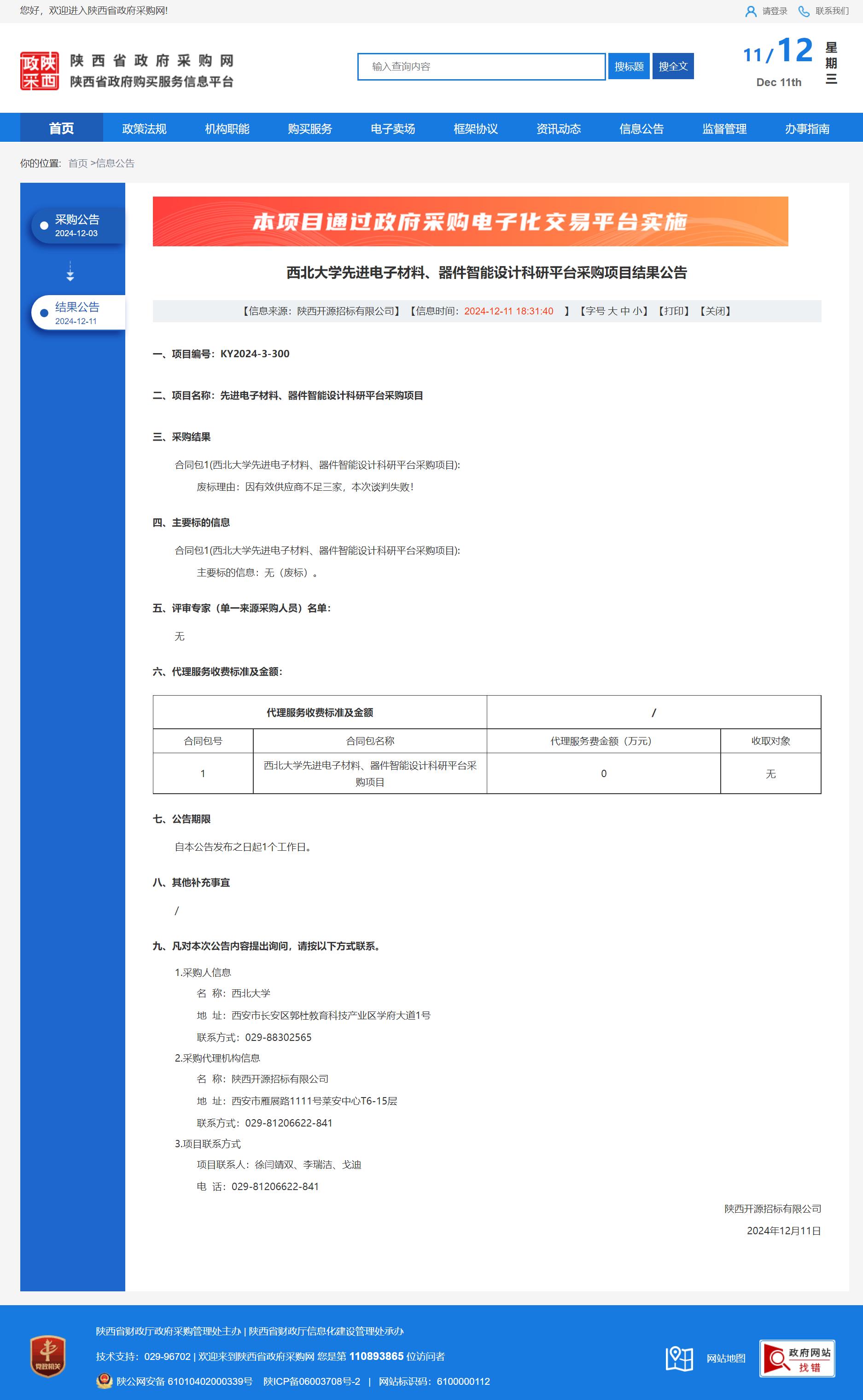 西北大学先进电子材料、器件智能设计科研平台采购项目结果公告