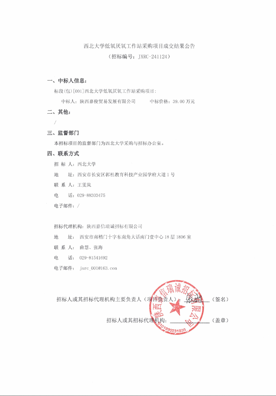 西北大学低氧厌氧工作站采购项目成交结果公告