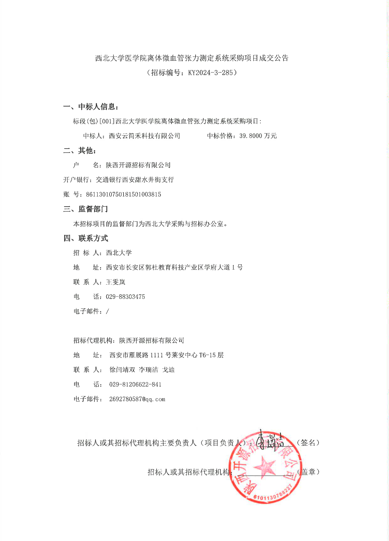 西北大学医学院离体微血管张力测定系统采购项目成交公告