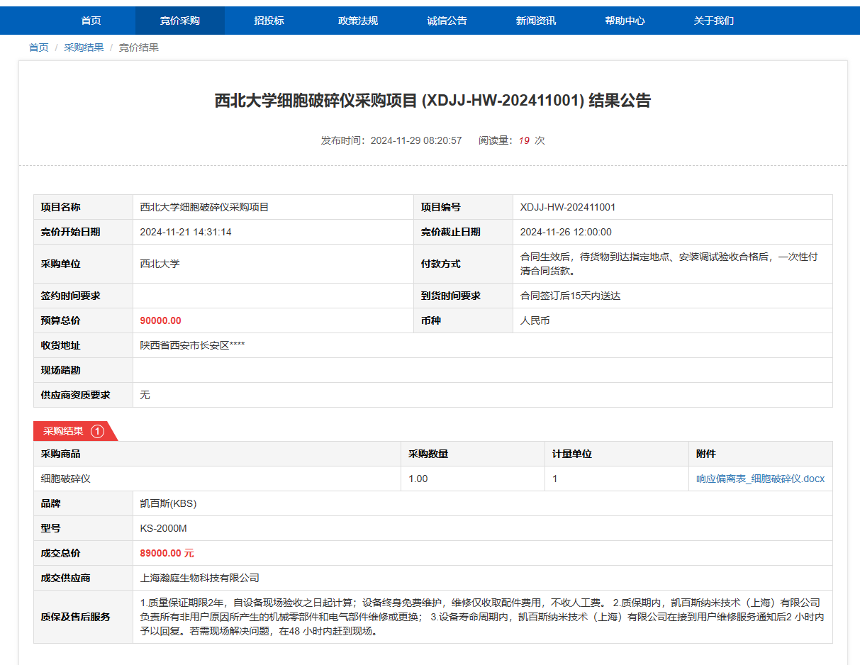 西北大学细胞破碎仪采购项目(XDJJ-HW-202411001)竞价结果公告