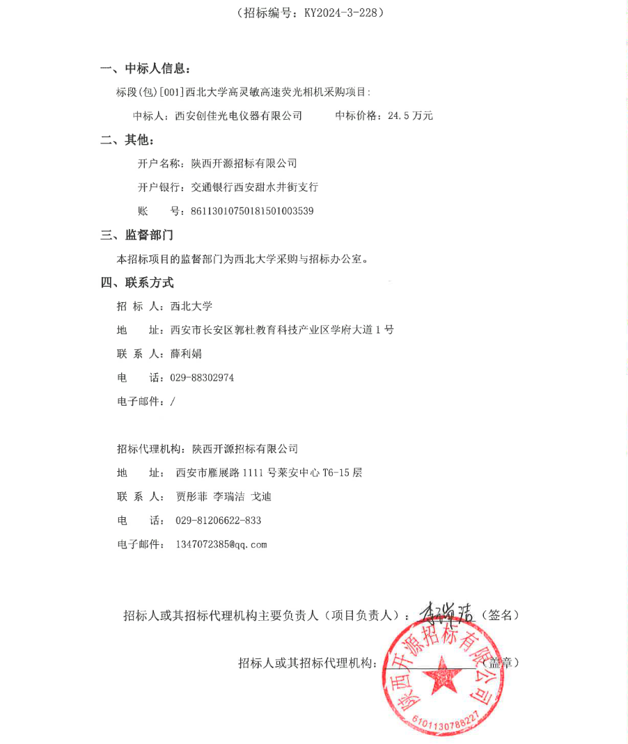 西北大学高灵敏高速荧光相机采购项目成交公告