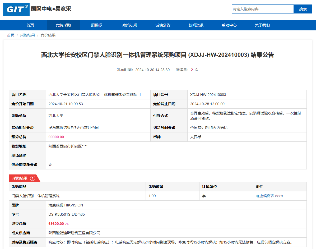 西北大学长安校区门禁人脸识别一体机管理系统采购项目(XDJJ-HW-202410003)竞价结果公告