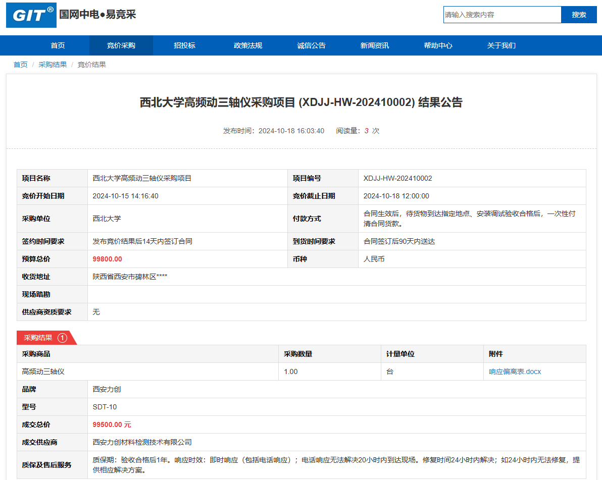 西北大学高频动三轴仪采购项目(XDJJ-HW-202410002)竞价结果公告