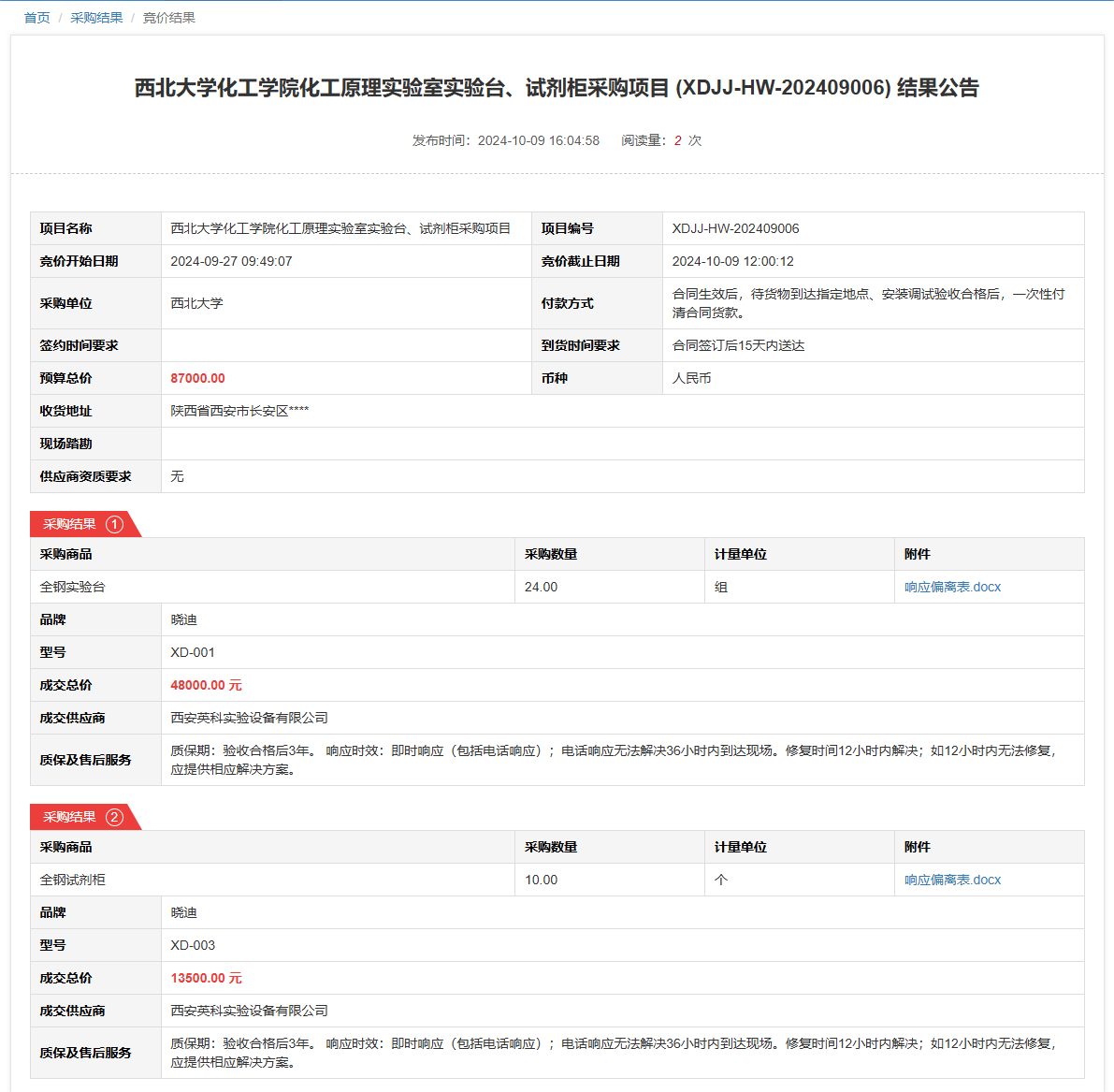 西北大学化工学院化工原理实验室实验台、试剂柜采购项目(XDJJ-HW-202409006)竞价结果公告