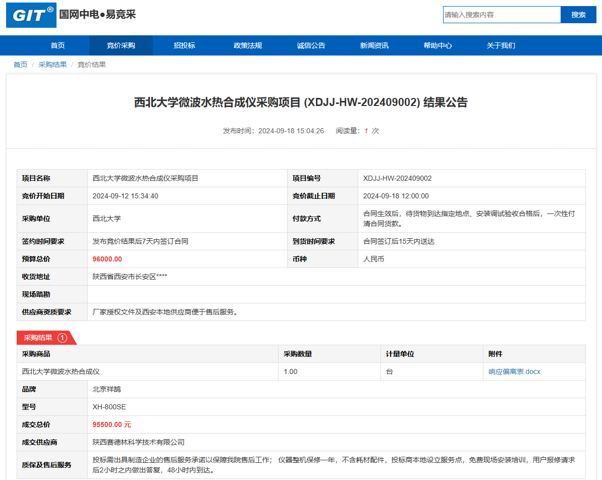 西北大学微波水热合成仪采购项目 (XDJJ-HW-202409002)竞价结果公告