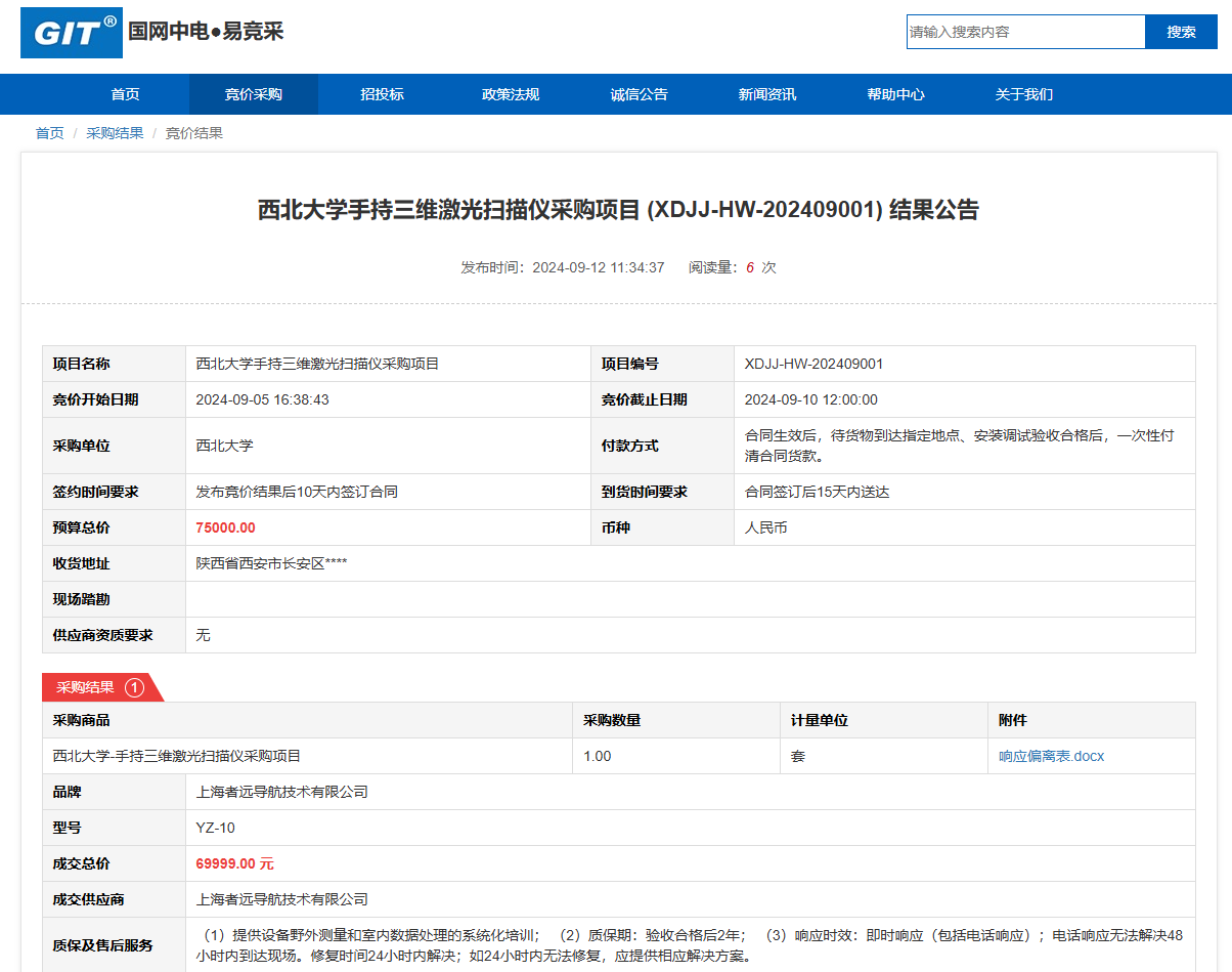 西北大学手持三维激光扫描仪采购项目 (XDJJ-HW-202409001)竞价结果公告
