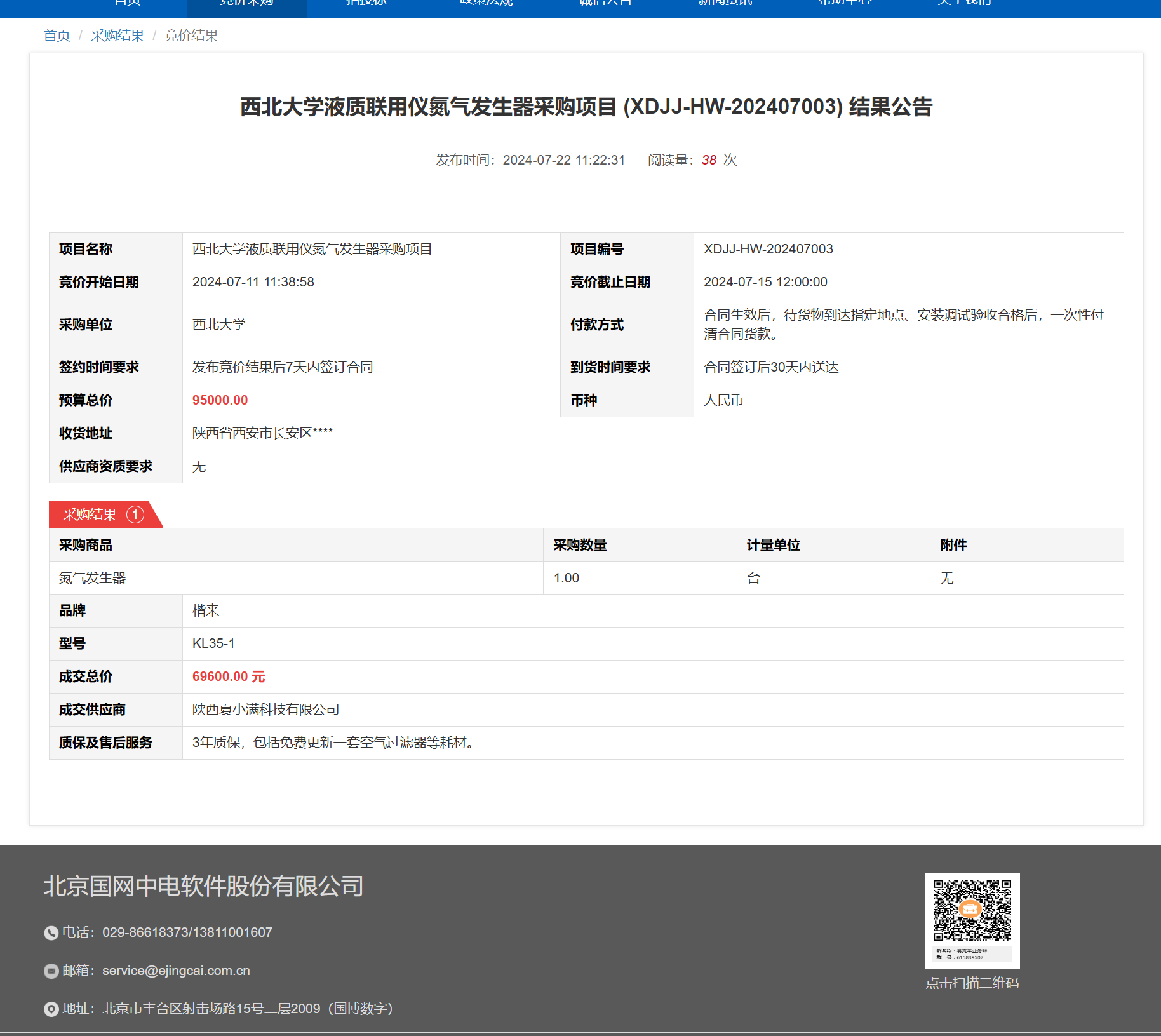 西北大学液质联用仪氮气发生器采购项目 (XDJJ-HW-202407003) 竞价结果公告