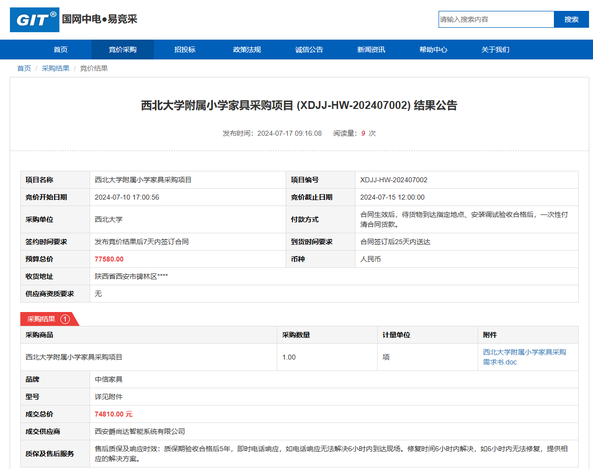 西北大学附属小学家具采购项目 (XDJJ-HW-202407002) 竞价结果公告