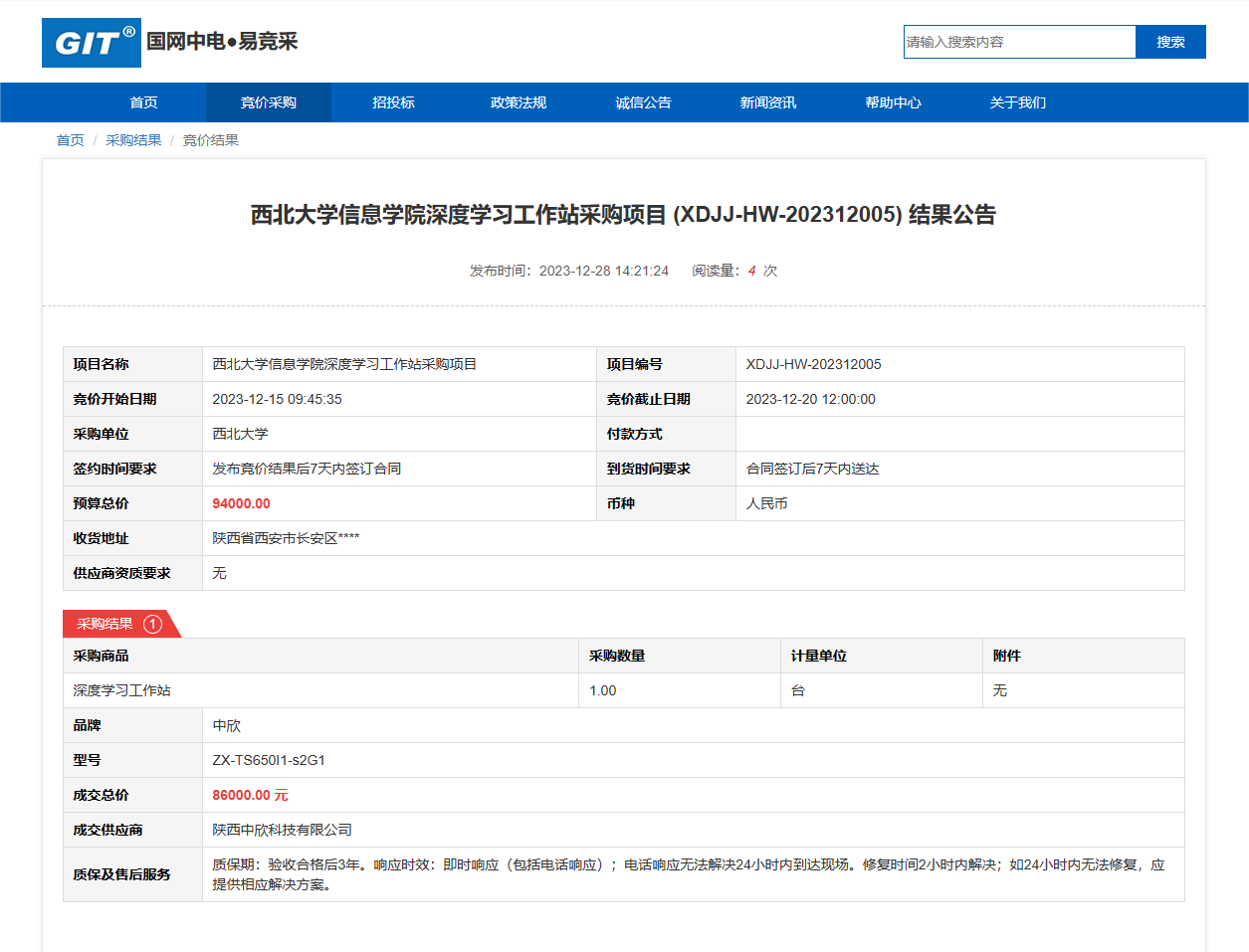 西北大学信息学院深度学习工作站采购项目 (XDJJ-HW-202312005) 竞价结果公告