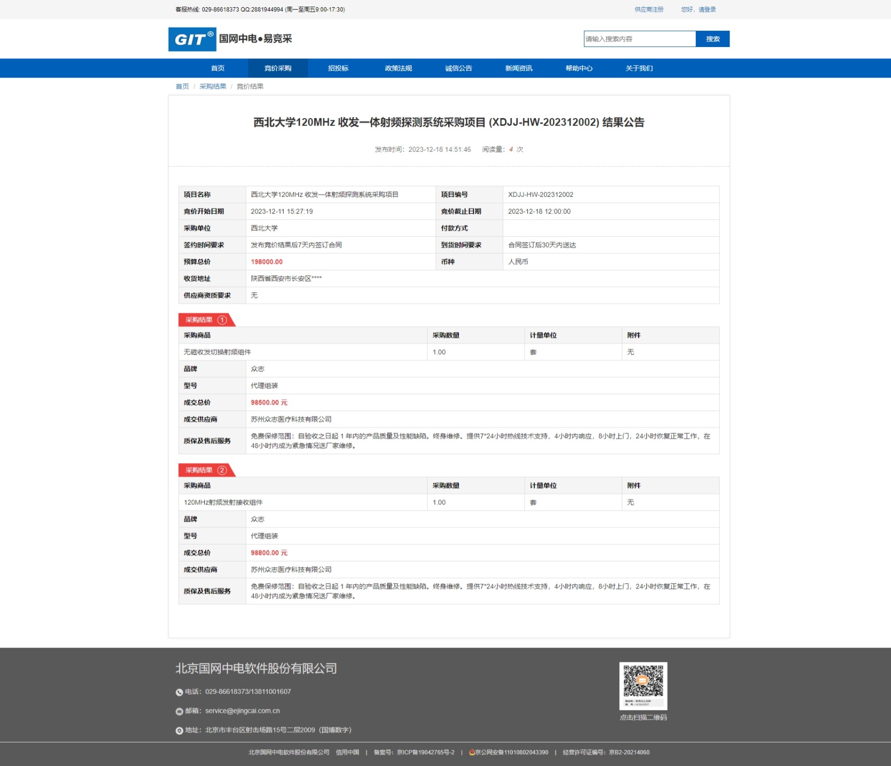 西北大学120MHz 收发一体射频探测系统采购项目 (XDJJ-HW-202312002) 结果公告