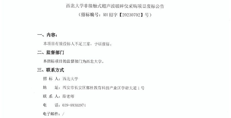 西北大学非接触式超声波破碎仪采购项目废标公告