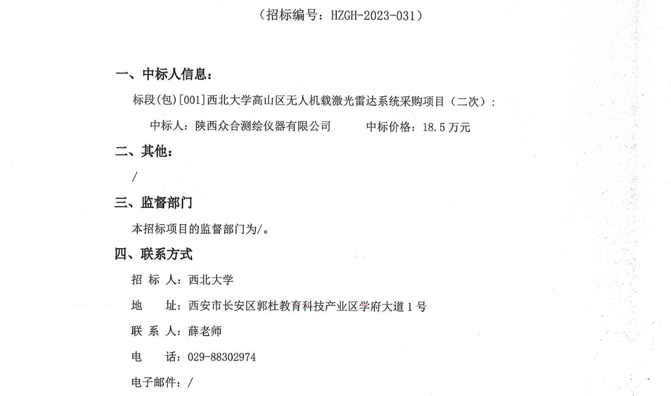 西北大学高山区无人机载激光雷达系统采购项目(二次)中标结果公示