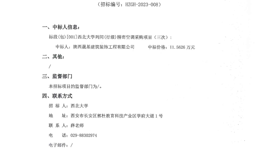 西北大学列间(行级)精密空调采购项目(三次)中标结果公示