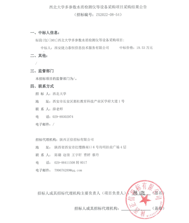 西北大学多参数水质检测仪等设备采购项目采购结果公告