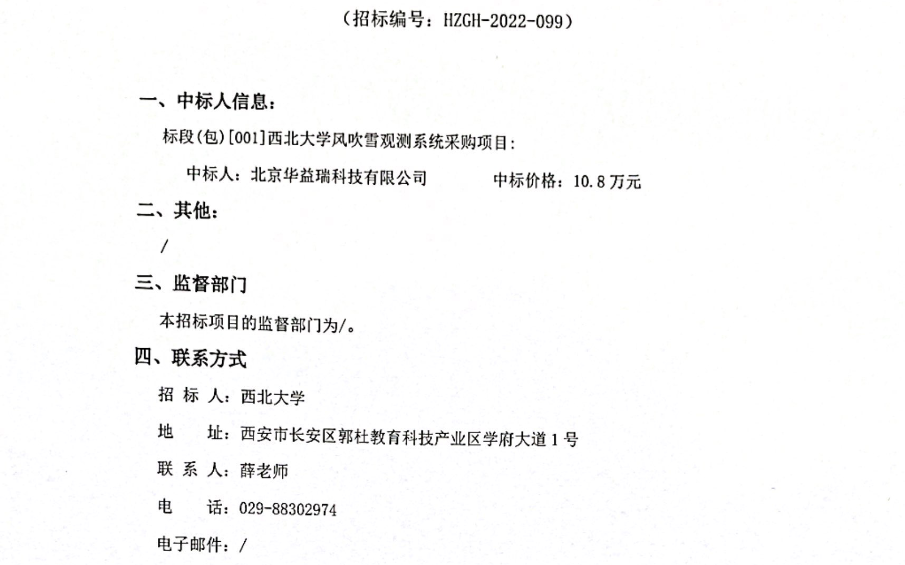 西北大学风吹雪观测系统采购项目成交结果公示