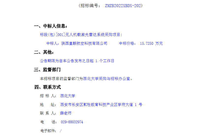 西北大学无人机载激光雷达系统采购项目采购结果公告
