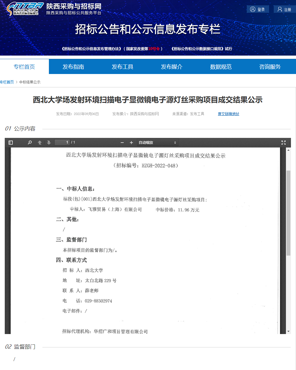 西北大学场发射环境扫描电子显微镜电子源灯丝采购项目成交结果公示