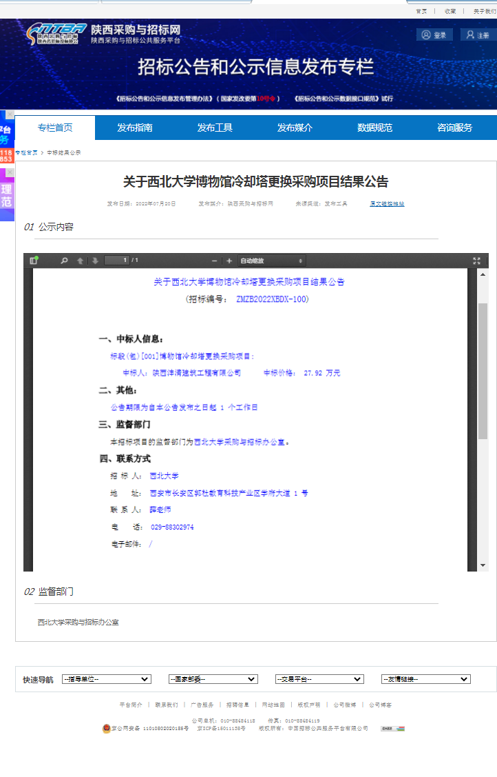关于西北大学博物馆冷却塔更换采购项目结果公告