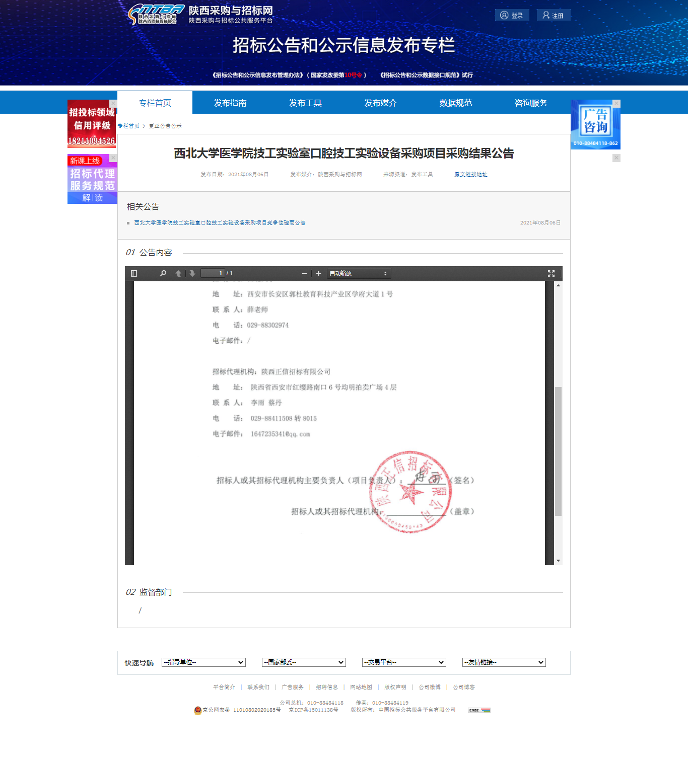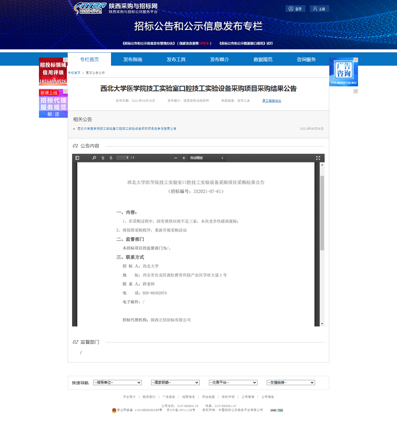 西北大学医学院技工实验室口腔技工实验设备采购项目采购结果公告
