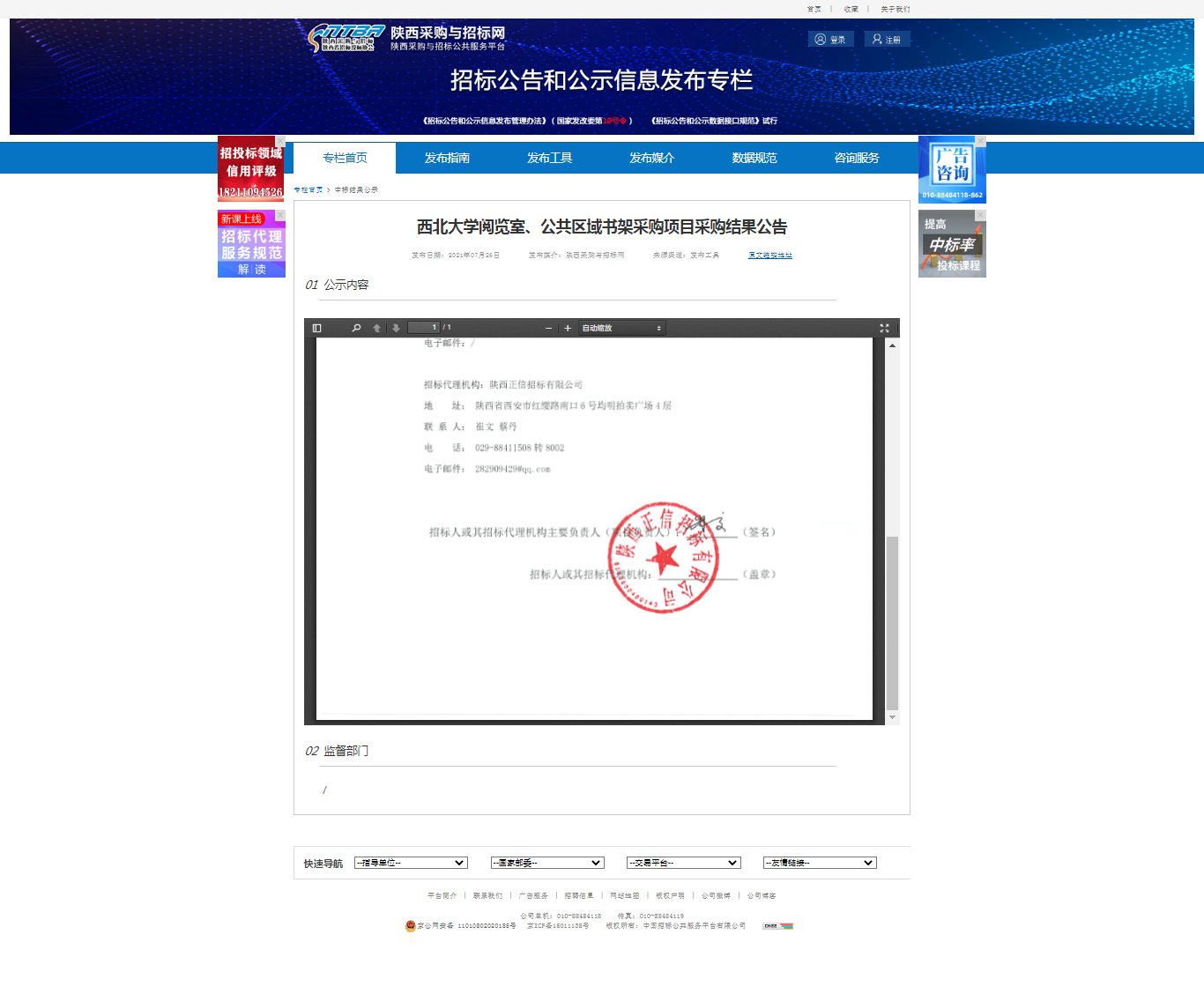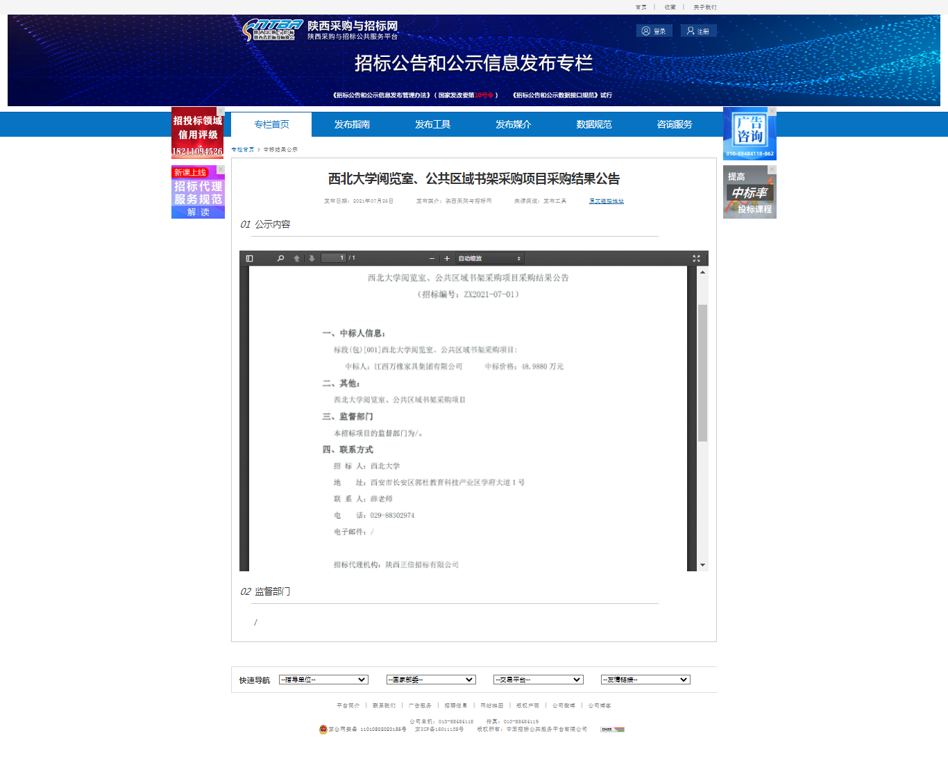 西北大学阅览室、公共区域书架采购项目采购结果公告