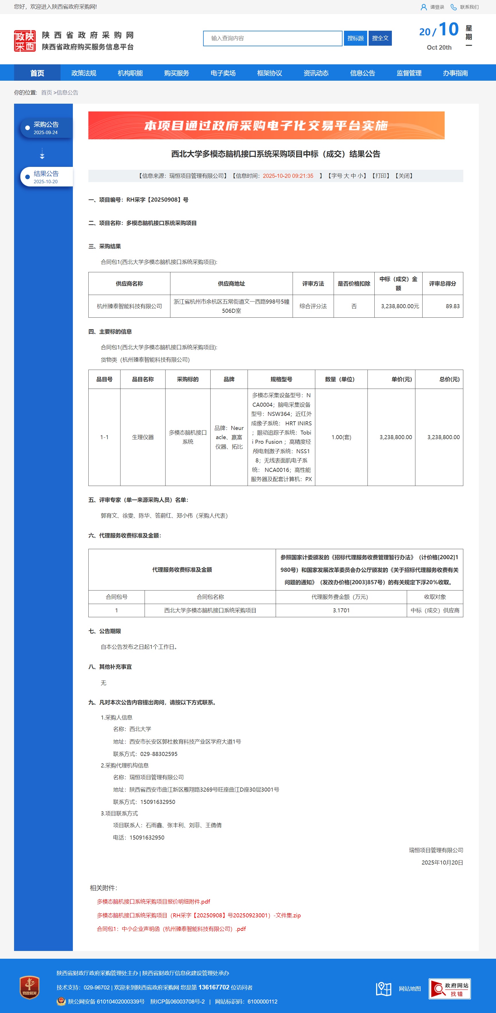 西北大学多模态脑机接口系统采购项目中标(成交)结果公告
