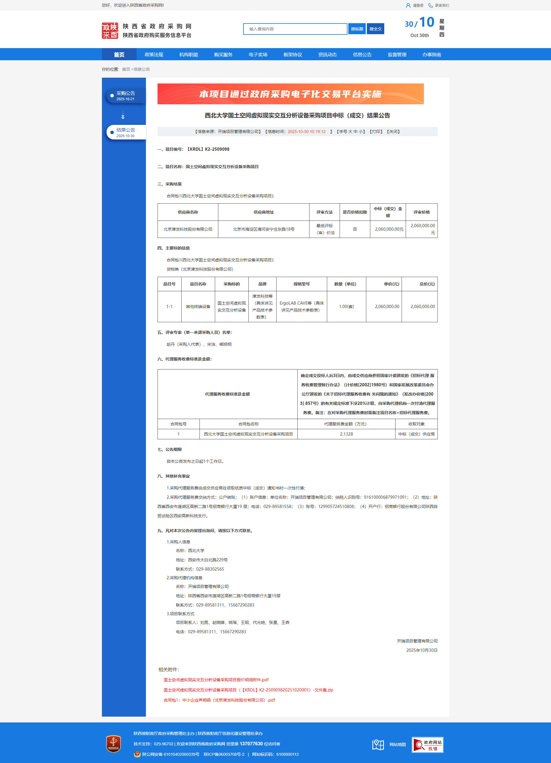 西北大学国土空间虚拟现实交互分析设备采购项目中标(成交)结果公告