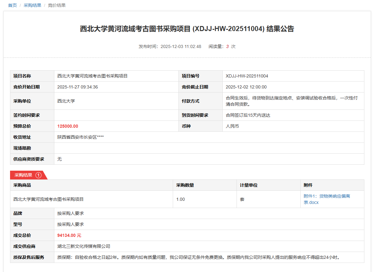 西北大学黄河流域考古图书采购项目(XDJJ-HW-202511004)竞价结果公告
