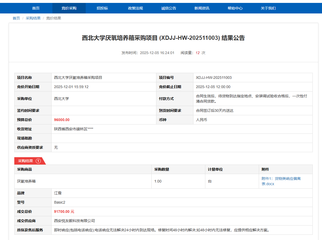 西北大学厌氧培养箱采购项目(XDJJ-HW-202511003)竞价结果公告