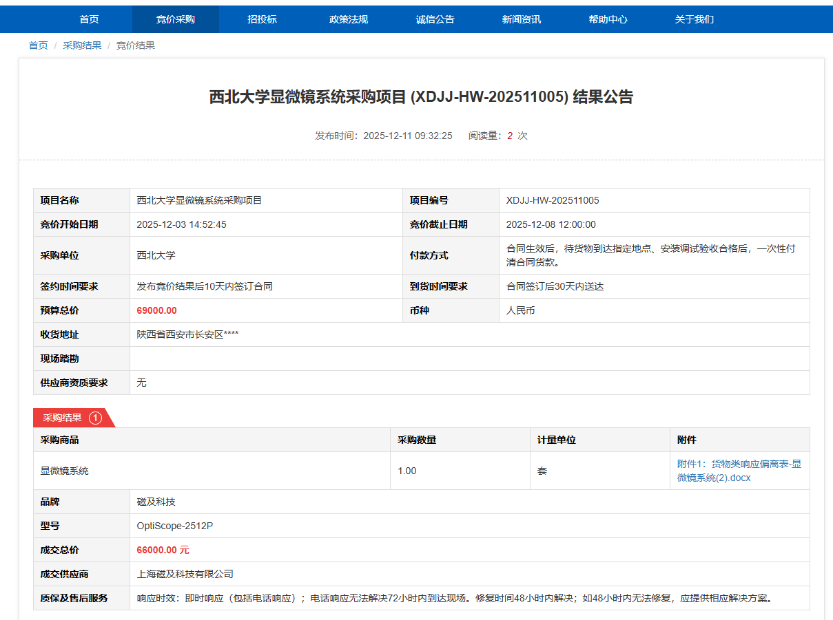 西北大学显微镜系统采购项目(XDJJ-HW-202511005)竞价结果公告