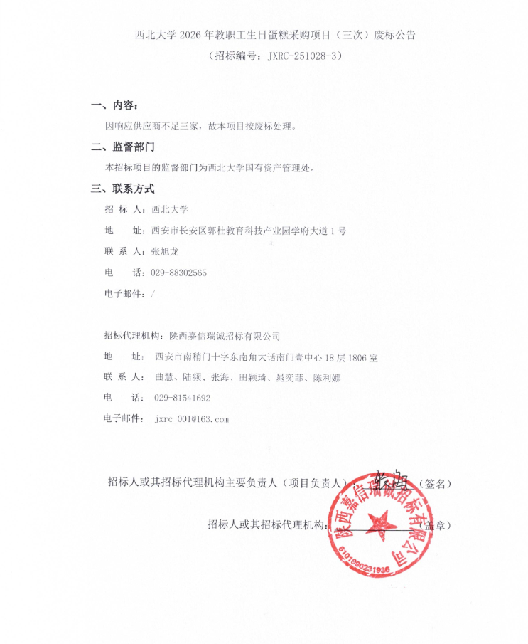 西北大学2026年教职工生日蛋糕采购项目(三次)废标公告