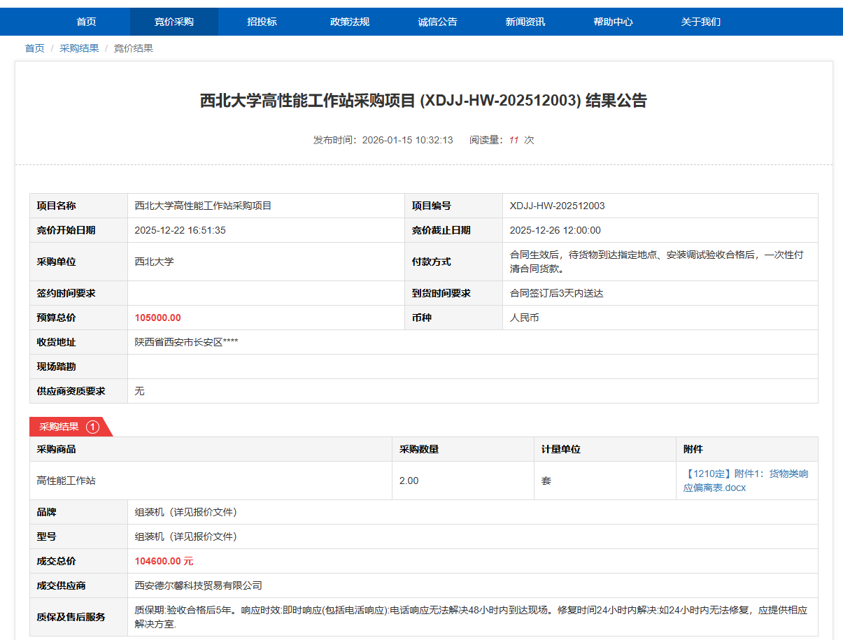 西北大学高性能工作站采购项目(XDJJ-HW-202512003)竞价结果公告