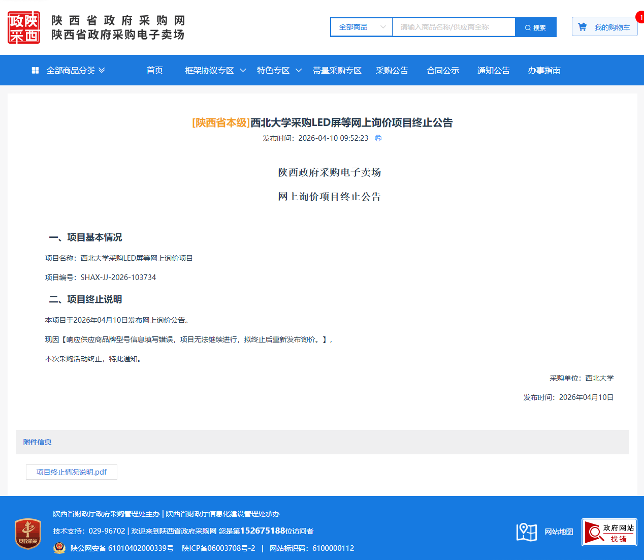 西北大学采购LED屏等网上询价项目终止公告