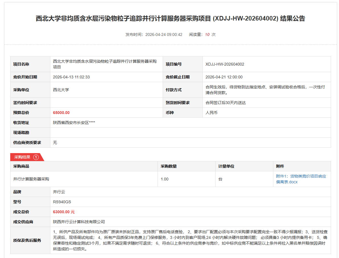 西北大学非均质含水层污染物粒子追踪并行计算服务器采购项目(XDJJ-HW-202604002)竞价结果公告