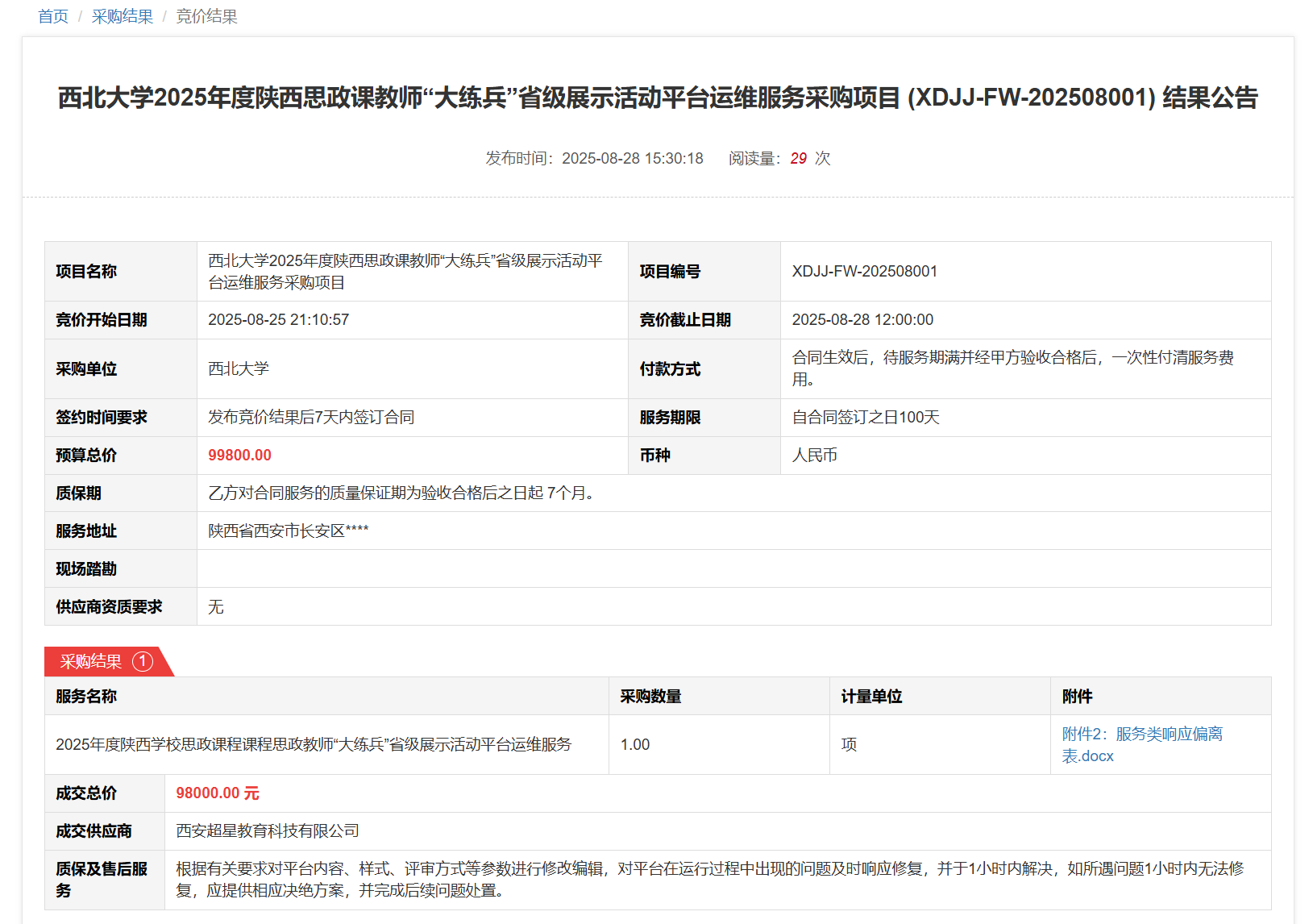 西北大学2025年度陕西思政课教师“大练兵”省级展示活动平台运维服务采购项目(XDJJ-FW-202508001)竞价结果公告