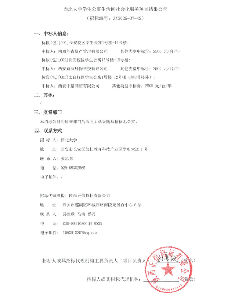 西北大学学生公寓生活间社会化服务项目结果公告
