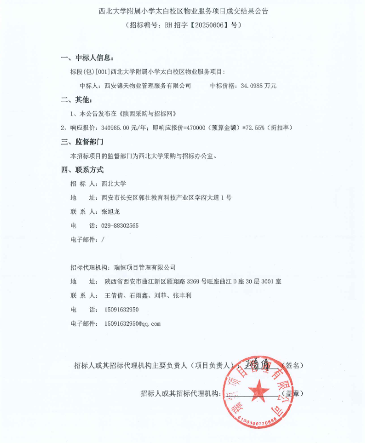 西北大学附属小学太白校区物业服务项目成交结果公告